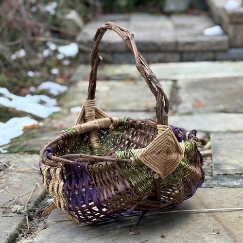 Learn to make a basket using a mix of natural materials, including grapevine, wisteria, maypop vine, and red dogwood twigs harvested from the grounds at 577. This basket, known as a gathering or “egg-style” ribbed basket, begins by binding two grapevine or wisteria hoops. Participants will learn the God’s Eye method to fasten the two hoops together, add red dogwood ribs or spokes, and then weave materials like maypop vine and flat reed into the base of the basket.