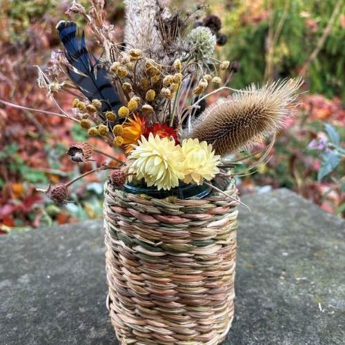 Learn a basic twining technique to weave yellow flag iris leaves and gladiolus leaves into a woven vase. Mason jars will be provided to assist in weaving and will be taken home to use inside your vase. This technique of weaving with long leaves creates a soft texture with a nice variation in colors throughout the work.