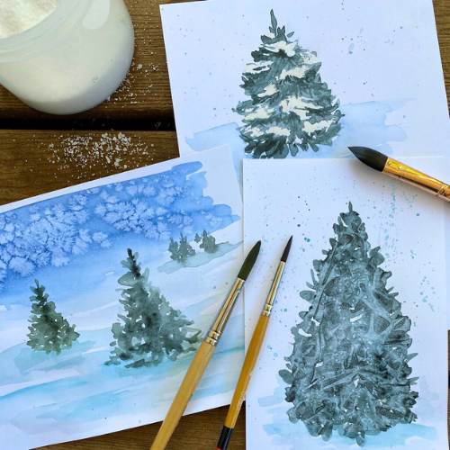 Have fun exploring multiple ways to paint a variety of evergreen trees and wintry landscapes. Watercolor enthusiasts will enjoy trying different brushes, papers, and techniques, including experiments with salt on wet washes to create starry skies & snowy weather.